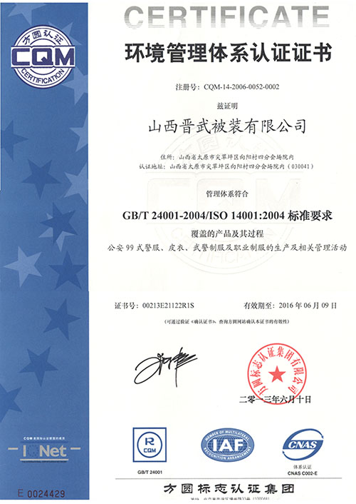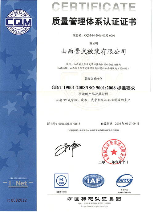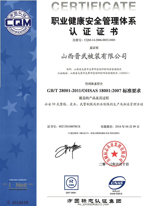 晋武被装自1999年先后通过了ISO9001、ISO14001和OHS18001认证,并在2009年被获得了“中国优质产品”证书,同时先后从日本、德国、美国引进先进的生产设备和先进的生产工艺,在2011年年初,我公司被评为“质量、服务、信誉AAA级金牌单位”。